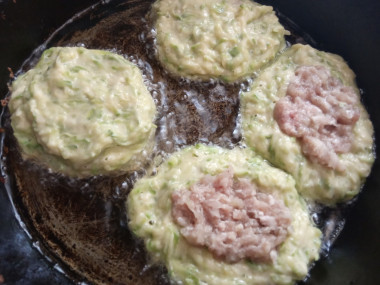 Сверху на фарш выложите еще немного кабачкового теста. Как выбрать сковороду и растительное масло для жарки читайте в статьях на эти темы. Ссылки в конце рецепта.