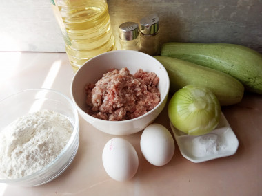 Как сделать оладьи из кабачков с фаршем на сковороде? Подготовьте необходимы продукты по списку.