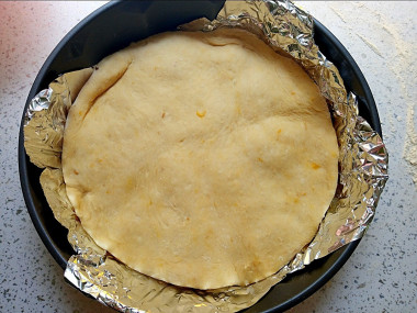 Пока тушатся яблоки, подошедшее тесто раскатайте в круг по диаметру формы.