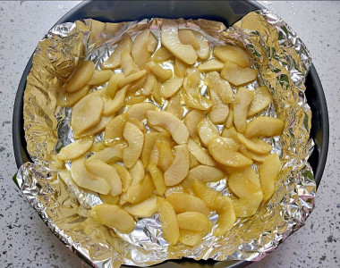 В форму для выпечки выложите яблоки в карамели и разровняйте. Диаметр моей формы 20 см, но можно и больше. Главное, чтобы яблоки покрывали все дно выбранной формы.