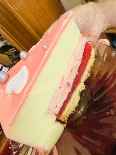 Вкус у торта идеальный. В меру сладкий, воздушный, с клубничным вкусом, ммм))