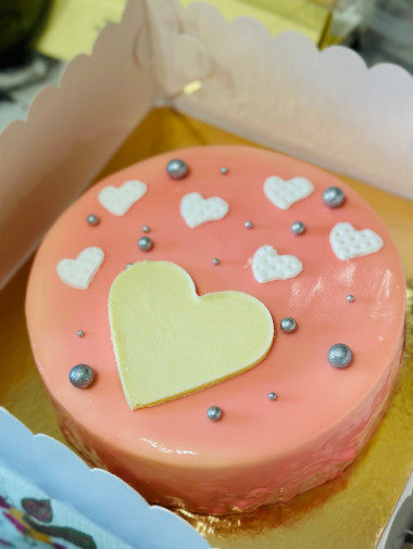 Вот над чизкейком мне ещё поработать, конечно… Или привыкнуть, что он так выглядит)) Впервые его делала. И глазурь с боков легла не ровно, но это я что-то не так сделала, так что буду тренироваться. В остальном проблем или вопросов не испытывала. А для украшения сделала сердечки небольшие из мастики, вылила сердечко побольше из белого шоколада (которое ехало в контейнере в форме и вроде даже не подтаяло сильно), и купленные шарики-драже.
