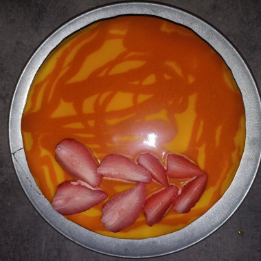 Для начинки и крамбла взяла форму по рецепту в 16 см, а для сборки с муссом взяла форму в 20 см (вместо 18), для чего в половину увеличила количество ингредиентов на мусс (ну и с запасом сделала для глазури), о чём вообще не жалею. Готовила в три дня - 1. Крамбл, конфи, чизкейк; 2. Сделала глазурь и в холодильник на 12 часов, как написано, мусс, сборка торта и в морозилку; 3. Глазурь, покрыла тортик и отправились в путь. В спокойном темпе, без спешки, без усталости. Украшала уже по приезде, но перед этим на часик в холодильник поставили тортик.