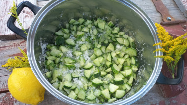 За это время огурцы дадут сок, необходимый для варки варенья. Огурцы бывают разных сортов и степени зрелости, поэтому количество сока они тоже дают разное. Если по истечении этого времени сока получилось мало, то добавьте в ёмкость немного фильтрованной воды. Помните, что чем меньше воды, тем гуще получится варенье.