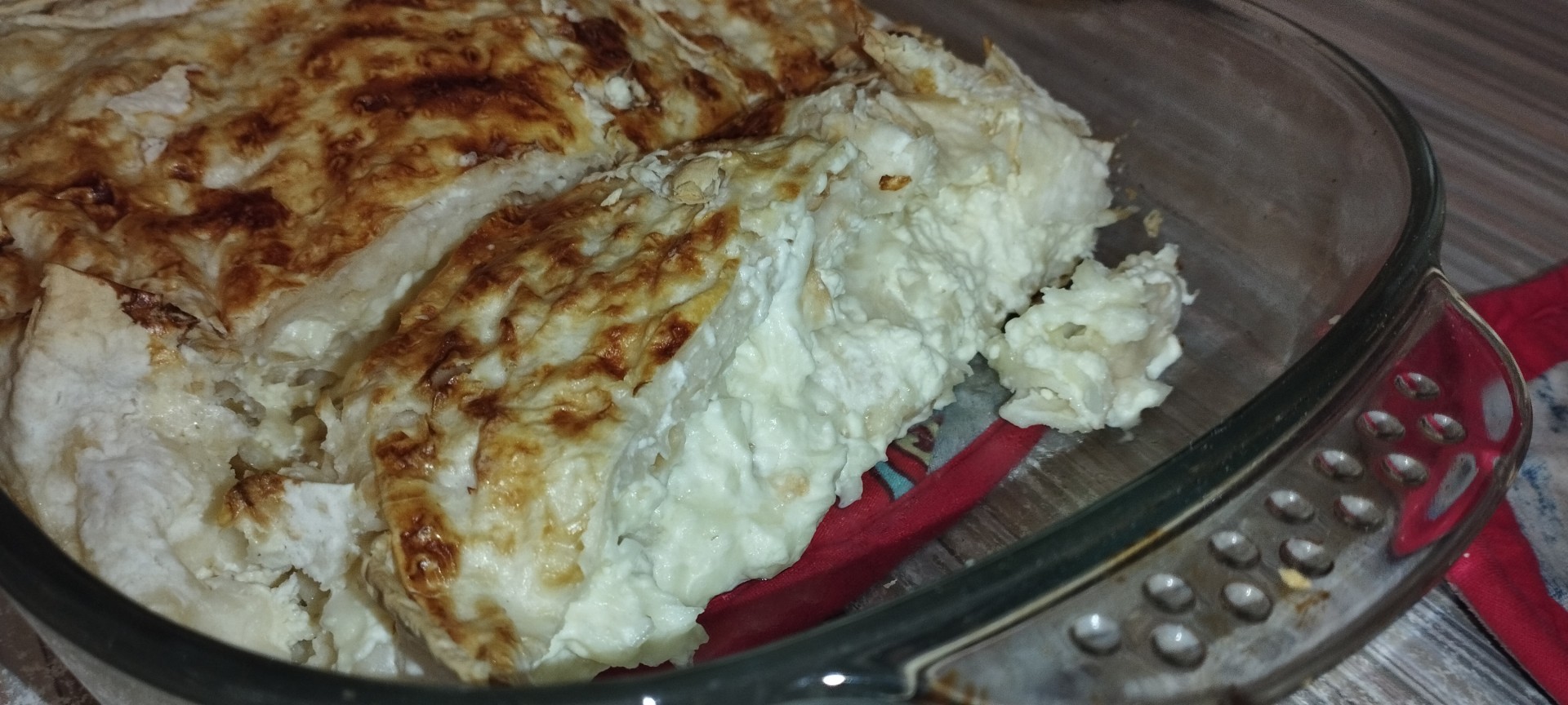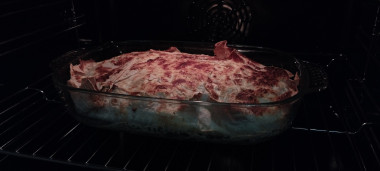 Затем в форму выложила лаваш, как и говорится в рецепте, с краями выходящими за края. Выкладывала слои начинки и пропитанных яично-кефирной смесью кусочков лаваша.