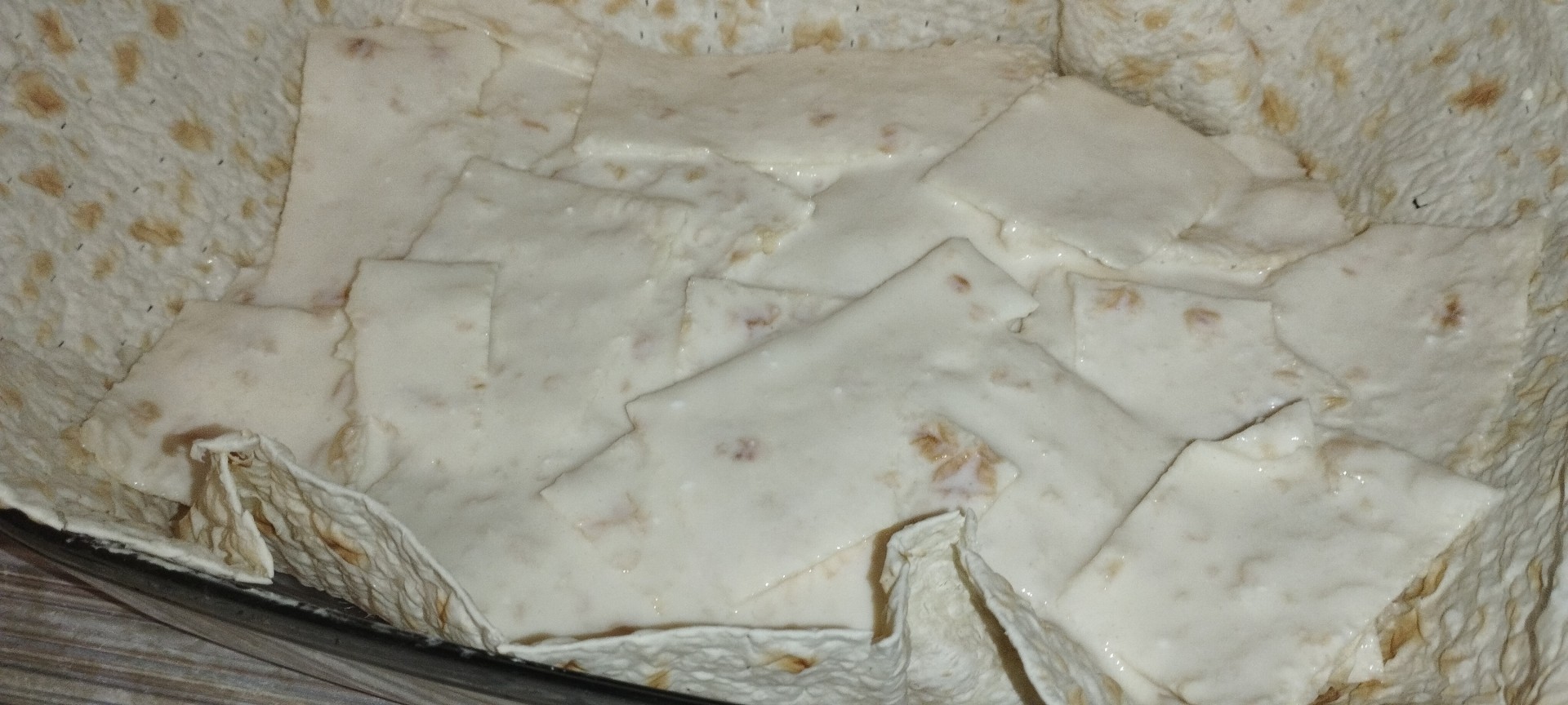 Первую треть кусочков лаваша обмакните в кефирно-яичную смесь и выложите внахлест в форму на лаваш в один слой.Шаг 11: