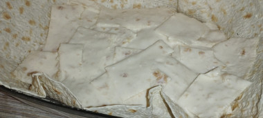 Из второго лаваша вырежьте прямоугольник (или другую фигуру в зависимости от вашей формы), равный размерам формы. Он будет верхом пирога, пока отложите его в сторону. Остатки от второго лаваша порежьте на небольшие кусочки. Разделите получившиеся кусочки на 3 части.Шаг 10: