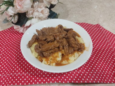 Затем добавила сметану, томатную пасту, соль, перец, специи. Долила воды так,чтобы было мясо закрыто и поставила тушиться на среднем ,а потом на маленьком огне до готовности мяса. На гарнир приготовила картофельное пюре.
