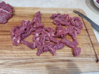 Свежее мясо говядины промойте под проточной холодной водой и тщательно обсушите бумажными полотенцами. Мясо нарежьте сначала тонкими пластинками, а затем длинной соломкой обязательно поперек волокон. Если есть сомнения в мясе (что будет долго готовиться), то мясо можно предварительно слегка отбить, а затем уже нарезать. Также перед жаркой мяса можно его в воде довести до кипения, промыть, а затем обжаривать.