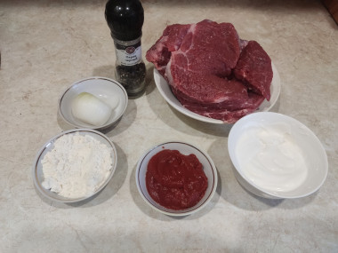 Как сделать бефстроганов классический из говядины? Подготовьте ингредиенты. Для приготовления бефстроганов следует брать свежее мясо говядины, без прожилок, плёнок и жира. Лучше это будет молодое мясо, тогда на его приготовление потребуется меньше времени. Лук среднего размера. Томатную пасту можно заменить помидорами в собственном соку или соусом. Специи можно брать любые по своему вкусу. Подготовьте глубокую сковороду или сотейник с толстым дном.