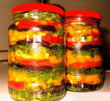 Разложите кружочки с помощью столовой ложки в стерильные баночки(банки можно стерилизовать в духовке, в микроволновке либо на водяной бане). Берите по одному кружочку баклажана, зачерпывая совсем немного заливки из помидоров и перца, и слоями отправляйте в банку. Когда баклажаны в кастрюле закончатся, отправьте вторую половину кружочков в помидорный соус, перемешайте и утрамбуйте снова по банкам.