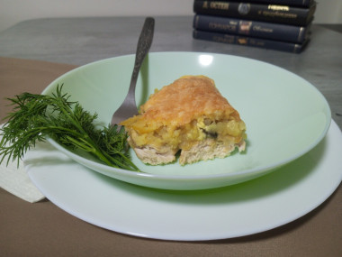 Честно ! Мне не понравилось!!!! Непонятно почему такой порядок выкладки несуразный! Сок с курицы должен стикать на картошку, а в итоге курица в своем соку плавает на дне ! Если кто и будет это недоразумение готовить, то лучше в таком порядке картофель -курица - грибы! Есть шанс что получится действительно стоящее блюдо ! А по этому рецепту полная несуразица вышла , не понравилось!