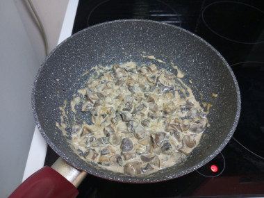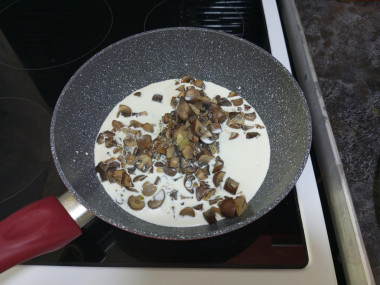 Грибы немного подсолите. Влейте к ним сливки. Добавьте сушеные травы и муку. Перемешайте и прогрейте все вместе еще пару минут. Соус немного загустеет.