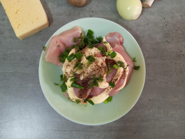 Отбитое куриное филе смажьте со всех сторон получившимся маринадом и оставьте полежать.