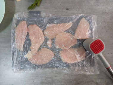 Филе промыла и высушила бумажным полотенцем. Затем нарезала тонкими кусочками и отбила с двух сторон. Прежде чем мясо отбить, накрыла пакетом, в котором курица лежала.