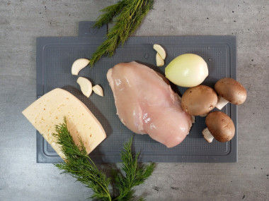 Калорийность продуктов: Куриное филе, Шампиньоны, Картошка, Лук, Твёрдый сыр, Сливки жирные, Сметана, Чеснок, Пшеничная мука, Петрушка, Растительное масло, Перец черный молотый, Смесь трав, Соль
