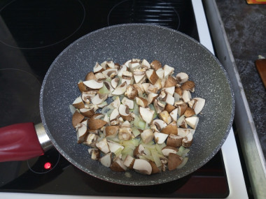 Шампиньоны промойте от загрязнений и мелко нарежьте. Выложите шампиньоны в сковороду к луку и обжаривайте все вместе 5-7 минут. При жарке из грибов появится немного влаги. Она должна испариться.
