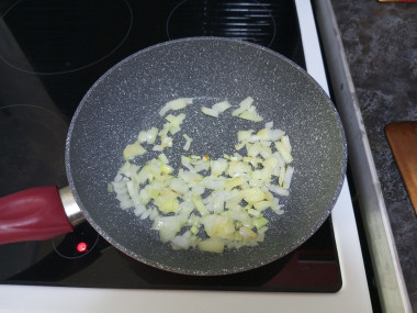 В это время займитесь грибной начинкой. Лук очистите от шелухи и ополосните в холодной воде. Затем лук мелко нарежьте. На горячую сковороду налейте немного растительного масла и обжарьте нарезанный лук 2-3 минуты, до прозрачности.