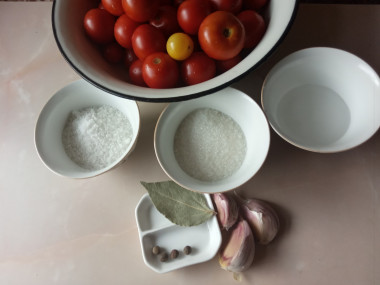 Как сделать томаты пальчики оближешь без стерилизации на зиму? Подготовьте все необходимые продукты. Для засолки и маринования подходят помидоры небольшого размера удлиненной формы - сливовидные. Выбирайте спелые томаты однородного цвета без повреждений, желательно грунтовые. У меня получилось 3 банки заготовки: одна литровая и две по 0,75 литра. На каждую из трех банок идет по 1 чайной ложке уксуса. На 2-литровую - 2 ложки, на 3-литровую - 3 ложки.