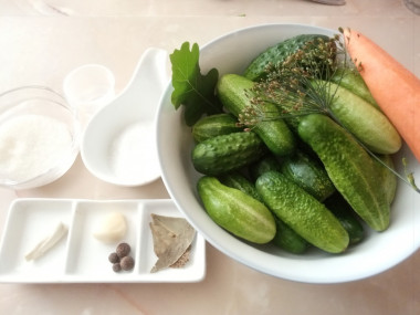 Как сделать маринованные огурцы с морковью? Подготовьте все необходимые продукты. Огурчики берите свежие, недавнего сбора, небольшого размера, с пупырышками. Если вы не знаете, когда были собраны огурцы и какой они степени свежести, то замочите их предварительно на несколько часов в ледяной воде. Морковка у меня также свежая, молодая. О тонкостях зимних заготовок читайте в статье в конце этого рецепта.