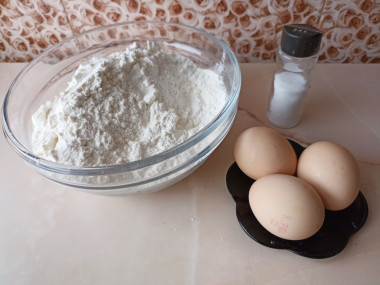 Как сделать яичную домашнюю лапшу? Подготовьте продукты. В этом рецепте очень простые пропорции — на каждые 100 грамм муки берется одно яйцо и немного соли, щепотка. Вместо целых яиц можно взять только желтки, но я предпочитаю использовать яйца полностью.