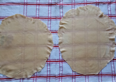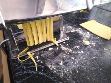 Решила сделать лапшу своими руками. На любимом сайте нашла рецепт "яичная лапша домашняя". Очень простой рецепт из простых продуктов. Готовила лапшу из двух яиц, уменьшив количество ингредиентов с помощью калькулятора сайта, на 3 взрослых и ребёнка, чтоб сразу сварить на ужин. Для лапши выбрала муку твёрдых сортов пшеницы. Я использовала домашние яйца, они у меня крупные, поэтому муки ушло немного больше. Взбила яйца и соль вилочкой, добавила муку и вымесила тесто руками. Получилось тугое, гладкое, однородное тесто. Оставила его в покое на пол часа по совету автора. Затем раскатала тонко-тонко с помощью тестораскатки толщиной 1-2 мм. После нарезала тесто с помощью лапшерезки на полоски шириной 4-5 мм. Разложила лапшу на деко, присыпав мукой, и оставила на пару часов по рекомендации автора перед варкой.