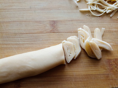Получившийся пласт хорошо обсыпьте мукой с обеих сторон и сверните в рулет. Острым ножом нарежьте рулет на тонкие колечки, шириной 3-4 мм.