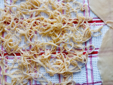Готовую лапшу еще раз слегка припылите мукой и оставьте на столе до полного высыхания, если вы планируете хранить ее, или на пару часов, если хотите готовить сразу.