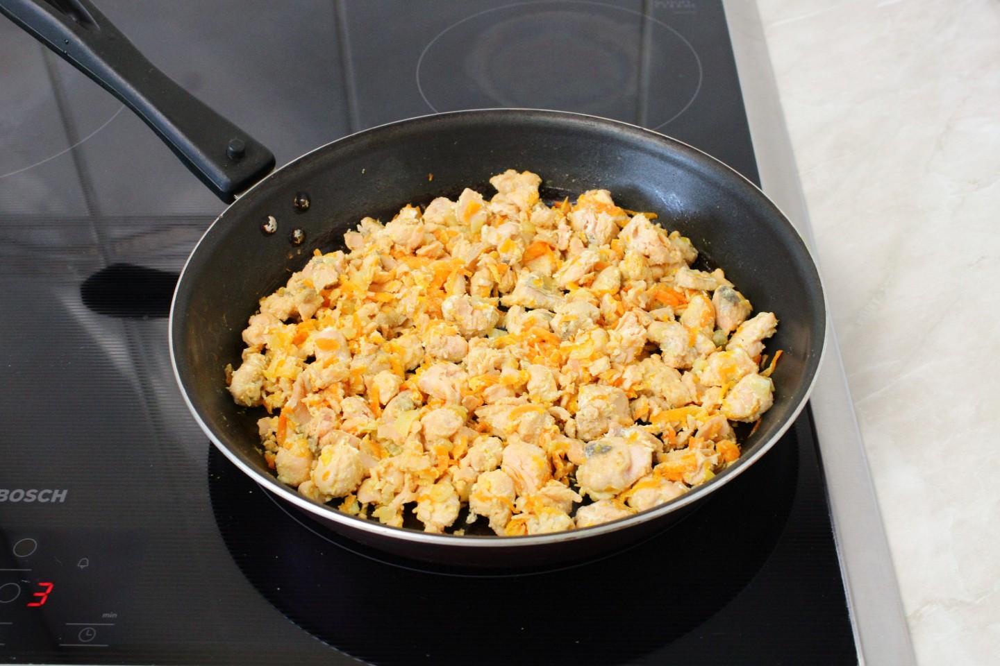 На сковороде слегка разогрейте растительное масло, обжарьте репчатый лук и морковь на среднем огне, помешивая, примерно 5-7 минут. С выбором сковороды, масла и температуры обжаривания помогут статьи по соответствующим ссылкам после описания шагов. Выложите к овощам рыбное филе, посолите, добавьте черный молотый перец, перемешайте. Обжарьте рыбу с овощами около 10 минут. Начинку остудите.