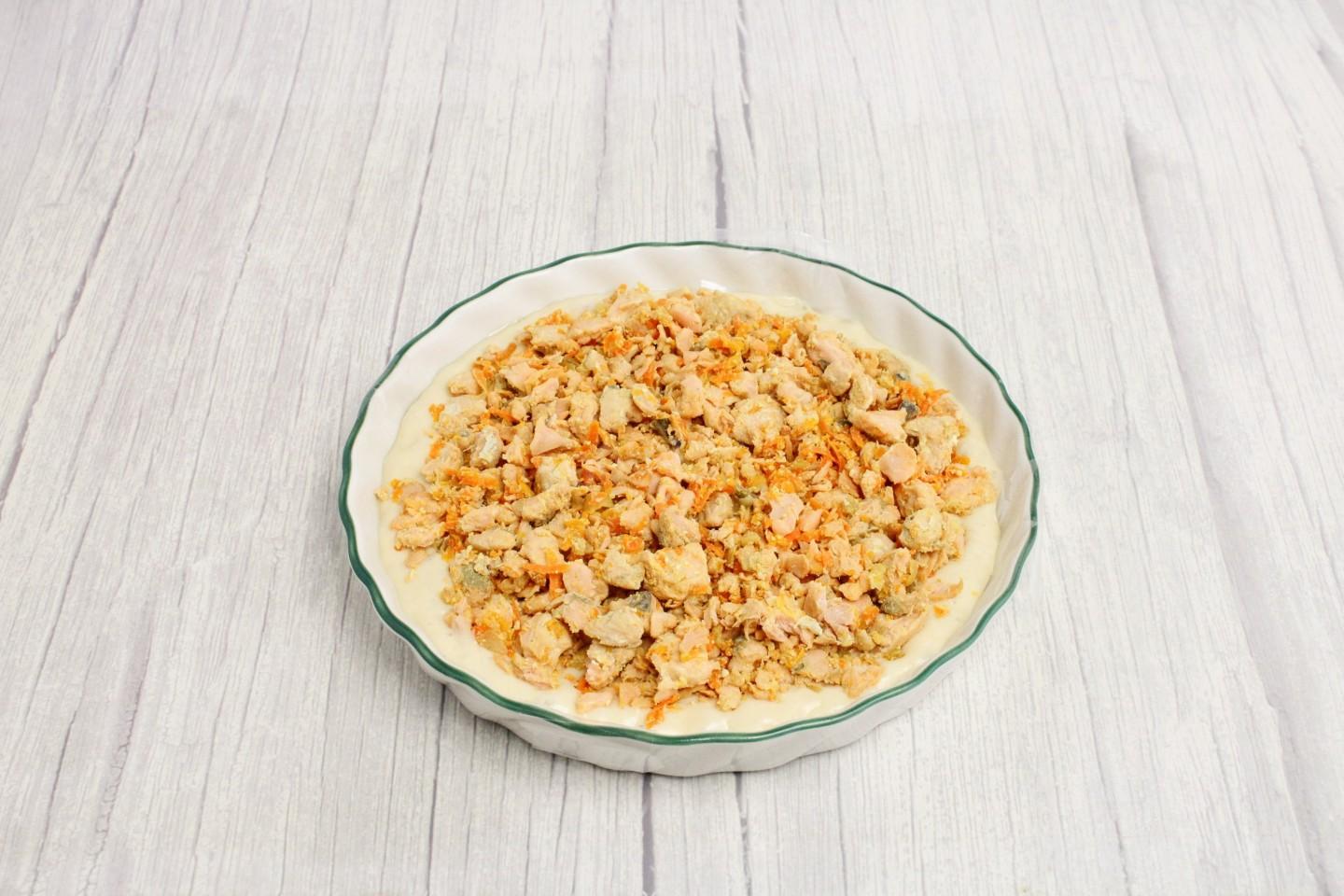 Форму для выпечки смажьте небольшим количеством растительного масла. С выбором формы поможет статья в конце рецепта. Ссылка там же. Включите духовку разогреваться на 180 С. Вылейте в форму примерно половину теста. Диаметр моей формы 23 см. Выложите на тесто равномерно рыбную начинку. Залейте начинку оставшимся тестом, разровняйте.