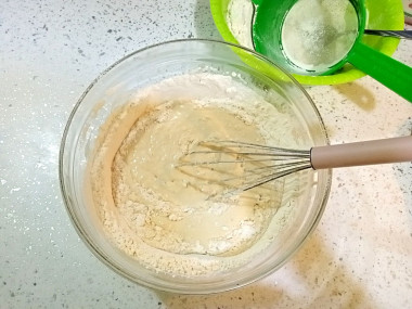 Порциями начните просеивать в будущее тесто муку. Важно просеять муку, чтобы насытить ее кислородом. Тогда выпечка получится воздушной и хорошо поднимется при выпекании.
