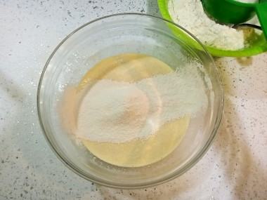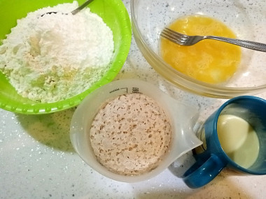 Добавьте к ингредиентам для опары 3 столовые ложки просеянной муки из отмеренного для теста количества.