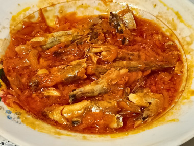 Приготовила мойву под овощами , вышла одна баночка 0,5 л и тарелочка на пробу. Мойву брала 700 грамм, очищала от голов, плавников и внутренностей. Готовила строго по рецепту. Крупная по размеру мойва сохранила свою форму, а которая помельче- развалилась на три части. Напоминает по вкусу магазинную кильку в томате. Очень вкусненько, особенно с картошечкой!!!