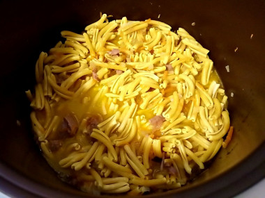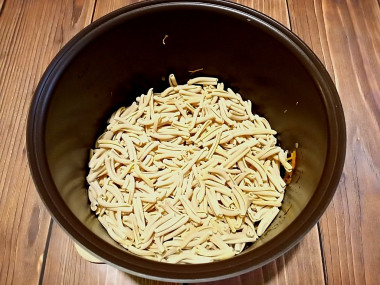 Затем выложите в чашу подготовленные сухие (сырые) макароны.