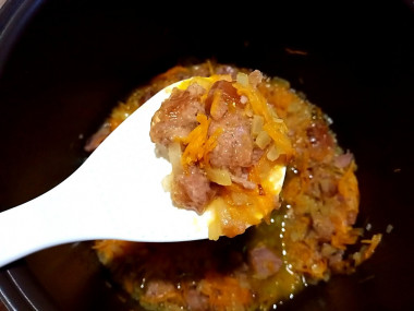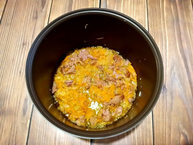 Включите мультиварку на режим "Жарка" и налейте в чашу немного растительного масла. Когда чаша нагреется выложите в неё измельченные лук и морковь. Обжаривайте овощи 3-4 минуты, периодически помешивая, чтобы они не подгорели. Закрывать при этом крышку не надо. Режимы вашей мультиварки могут отличаться. Об особенностях использования мультиварок и о том, как правильно выбрать масло для жарки читайте в отдельных статьях, ссылки в конце рецепта.