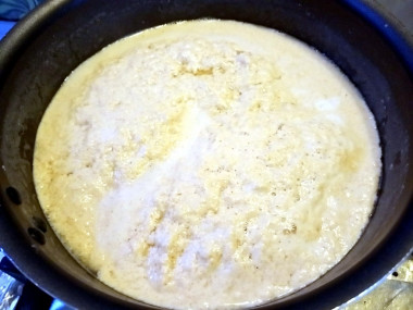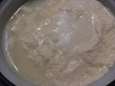 По мере закипания молока будет отделяться сыворотка, а само молоко свернётся творожистыми хлопьями. Это сигнал, что массу пора снимать с огня.