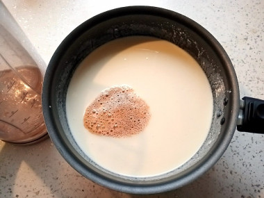 Прокисшее молоко перелейте в сотейник и добавьте туда же взбитое яйцо.