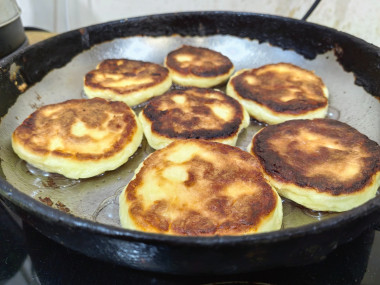 На сковороде хорошо разогрейте масло. Мне понадобилось 100 мл. Выложите сырники и готовьте на небольшом огне около 5-7 минут с одной стороны. Учтите, что времени на приготовление может понадобиться больше или меньше в зависимости от особенностей вашей сковороды и размера сырников. Большие и толстые сырники готовьте на минимальном огне чуть дольше, чем маленькие. Подробнее о выборе сковороды читайте по ссылке ниже.