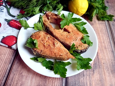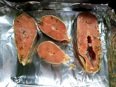 Захотелось нам попробовать запеченной красной рыбки. На сайте нашла рецепт сочных стейков горбуши в духовке в фольге. Этот способ устроил меня составом маринада и способом запекания.