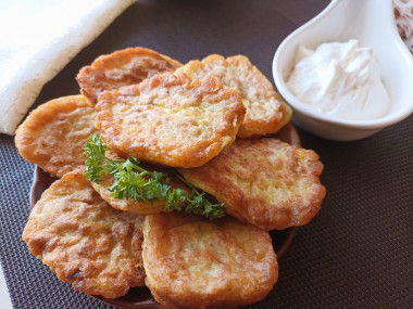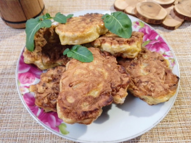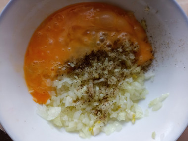 Лук мелко нарезала и замариновала в соли и смеси перцев. Спустя время добавила яйцо и муку с содой. Хорошо перемешала. Тесто получилось довольно жидким. Выкладывала его на разогретую сковороду столовой ложкой.