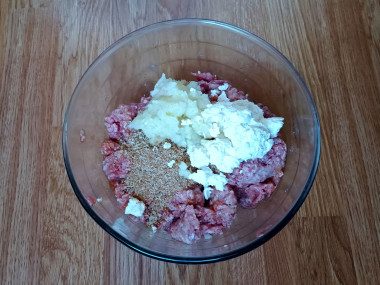 Фарш вы можете приготовить сами или использовать уже готовый. Я взяла домашний. Выложите фарш в миску, посолите и поперчите его. Учитывайте при этом, насколько соленый вы будете добавлять сыр. Рикотта нейтральная на вкус, я солю хорошо. Вбейте в фарш яйцо. Хорошо перемешайте.
