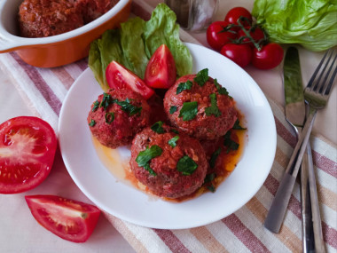 Смешала в миске фарш (использовала домашний), яйцо, соль, перец. Половинку луковицы измельчила в блендере и добавила к фаршу вместе с панировочными сухарями и рикоттой. Все тщательно вымешала до однородной консистенции. Соус готовила так: смешала воду, томатную пасту, соль, сахар, вторую половинку лука (также измельчила в блендере) и сушеные итальянские травы. Сформировала небольшие митболы и выложила их в форму для запекания. Залила соусом, слегка встряхнула форму, чтобы соус равномерно распределился, и отправила в разогретую до 190 градусов духовку на 50 минут. Примерно через 25 минут аккуратно перевернула митболы, чтобы они подрумянились с обеих сторон и хорошо пропитались соусом.