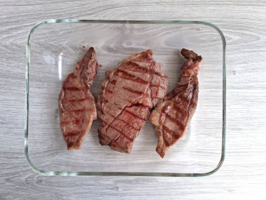 Обжаренные стейки я выложила в стеклянную форму и запекала 15 минут при 220°С. Для меня прожарка получилась идеальной. Но готовность зависит от толщины стейков и от личных предпочтений.