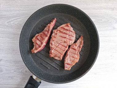Привлекло то, что мясо сначала обжаривается на сухой сковороде. Я воспользовалась сковородой-гриль, чтобы получить красивые полосочки. Мраморная говядина имеет множество прожилок нежного жирка, поэтому дополнительно масло не требуется.