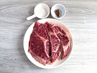 У меня была пара стейков из мраморной говядины. Поискала рецепты на сайте и нашла подходящий для себя - стейк из говядины в духовке.