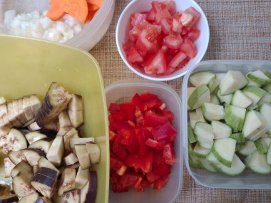 Баклажан нарежьте кружочками толщиной около 1 см, затем каждый кружочек измельчите на четвертинки. Посыпьте баклажан солью и оставьте на 10-15 минут, а тем временем подготовьте остальные овощи. Зачем посыпать синенький солью? Это нужно для того, чтобы избавиться от горечи, если она имеется в плодах.