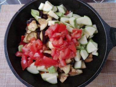 Следом добавьте помидор, соль по вкусу, все тщательно перемешайте, огонь убавьте до умеренного и накройте рагу крышкой. Тушите соте около 20-30 минут. Помидор должен дать сок, это позволит овощам именно тушиться, а не жариться. Проверьте через 2 минуты, хватает ли жидкости в сковороде, если нет, то добавьте совсем немного воды.