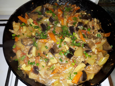 Посыпьте готовое блюдо зеленью, снимите посуду с огня и дайте овощам настояться некоторое время. Попробуйте еще раз на соль и, если требуется, досолите.