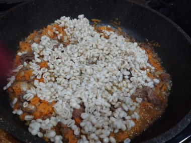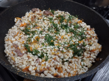Осталось только добавить в сковороду перловку, перемешать всё до однородности и прогреть блюдо ещё пять-семь минут. Затем попробуйте блюдо. Возможно, его нужно досолить по вкусу. Готово!