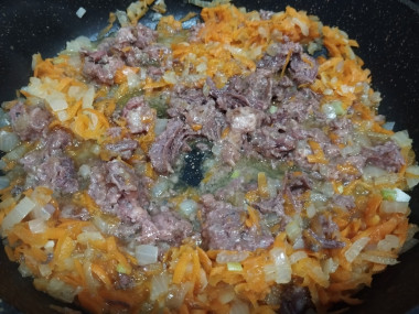 Тушёнку добавьте к готовой зажарке и потушите всё вместе пару минут.